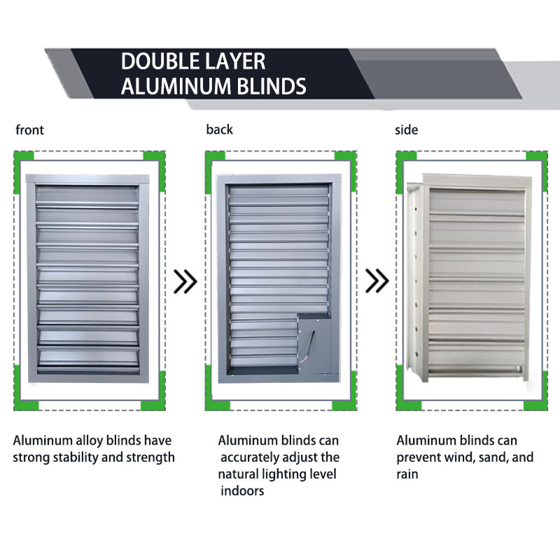 - Materials and Structure: Constructed from high-strength aluminum alloy profiles, the components undergo an aging and anodizing treatment. Their mechanical properties meet international standards, offering an elegant finish and exceptional corrosion resistance. Furthermore, the surface can be treated with a powder-coating finish—customized to user specifications—to further enhance its resistance to corrosion. The double-layer louver assembly consists of rain-proof blades equipped with integrated water-collection channels, side frames featuring drip-edge profiles, and streamlined adjustable blades.